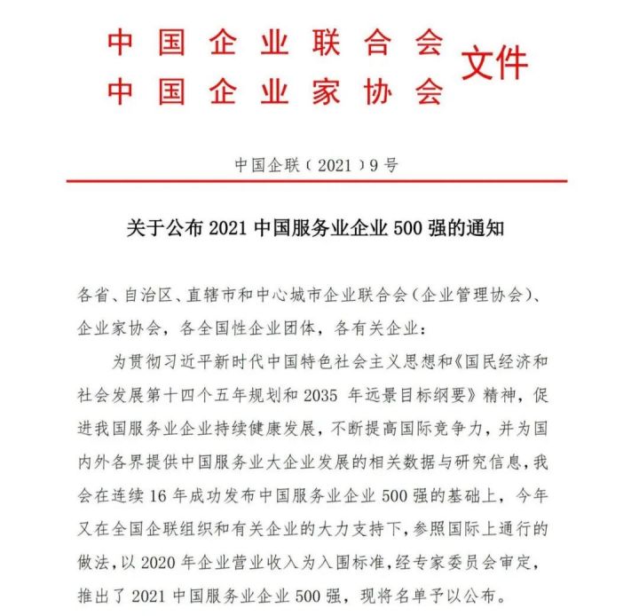 9月25日,中国企业联合会、中国企业家协会在中国500强企业高峰论坛上发布了2021中国企业500强、中国制造业企业500强、中国服务业企业500强、中国100大跨国公司、中国战略性新兴产业领军100强、中国大企业创新100强企业名单。天博综合平台网页版有限公司入围中国服务业企业500强第393位。