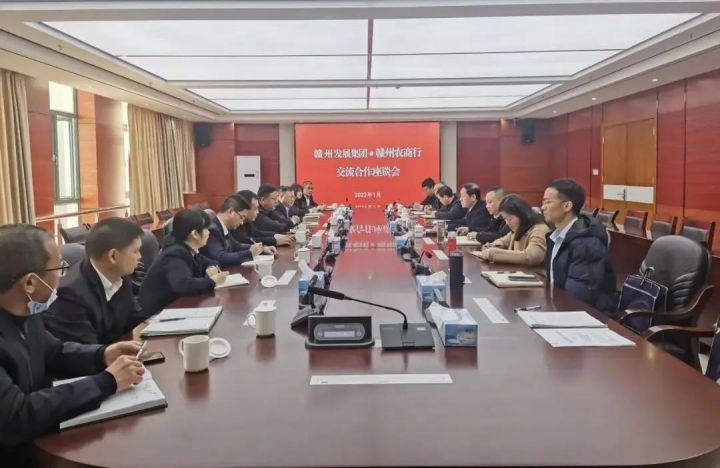 1月13日,赣州农商银行董事长陈迎宾、行长李洪一行到赣州发展集团对接洽谈合作事宜。赣州发展集团党委书记、董事长杨晓斌,集团党委委员、财务总监彭慧斌及相关子公司负责人参加座谈。