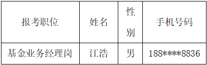 根据《天博综合平台网页版公开招聘公告》有关规定,由于基金业务经理岗赖斯琦同志自愿放弃体检与背景调查资格,按照总成绩从高到低顺序递补,现将递补人员体检与背景调查有关事项公示如下: