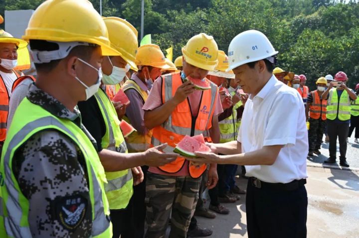 刘斌与一线劳动者亲切交谈,叮嘱他们在保证安全生产的同时,还要注意自己的身体健康,并要求项目部要关心爱护坚守一线的广大劳动者,备足备齐防暑降温物资,认真落实好防暑降温各项措施,为他们创造更好的工作条件,切实把党组织的关怀送到一线劳动者的心坎上。